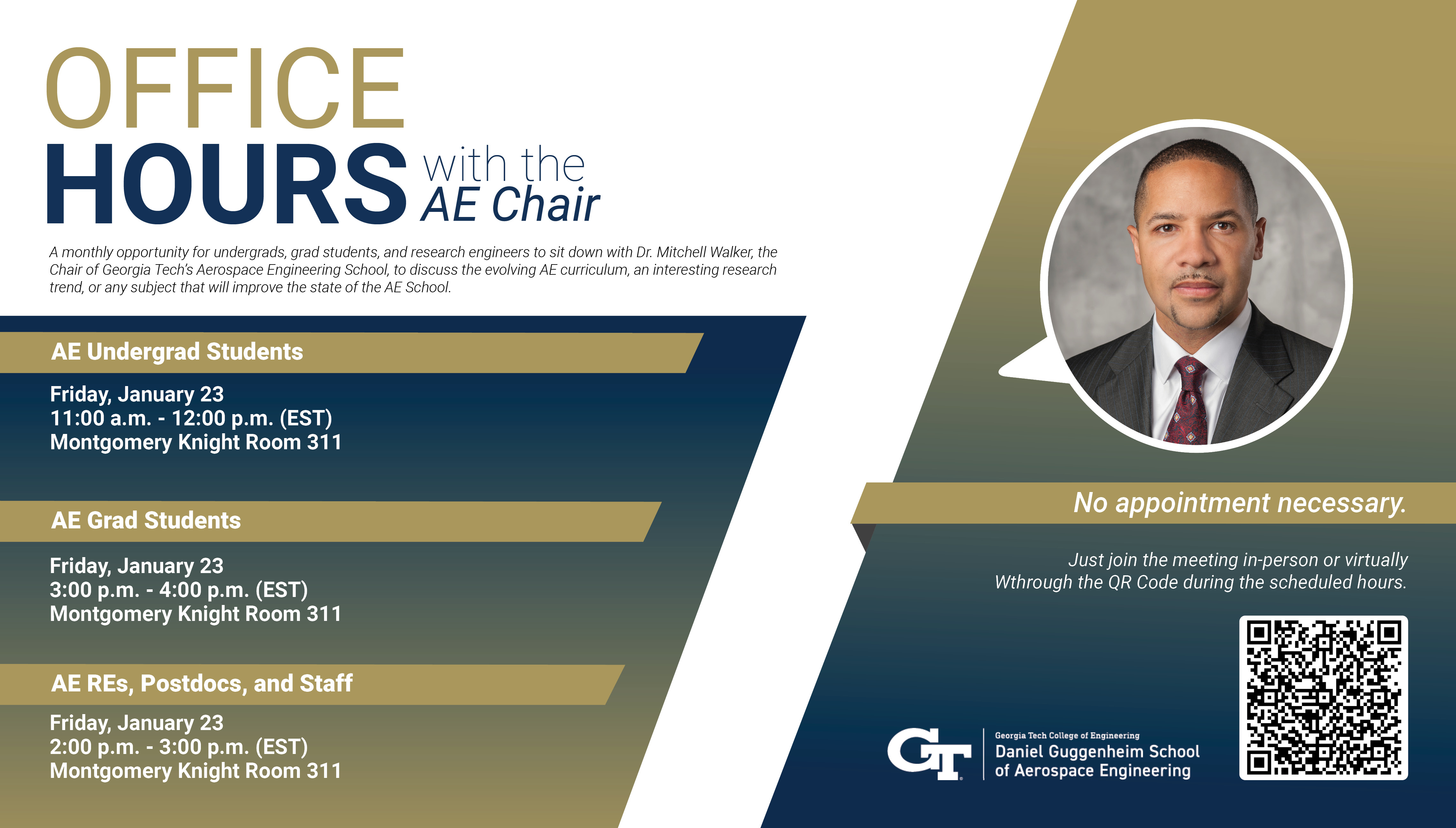 A monthly opportunity for undergraduate students to sit down with Dr. Mitchell Walker, the Chair of Georgia Tech’s Aerospace Engineering School, to discuss the evolving AE curriculum, an interesting research trend, or any subject that will improve the state of the AE School. No appointment necessary. Just join the meeting in person or virtually during the scheduled hours.