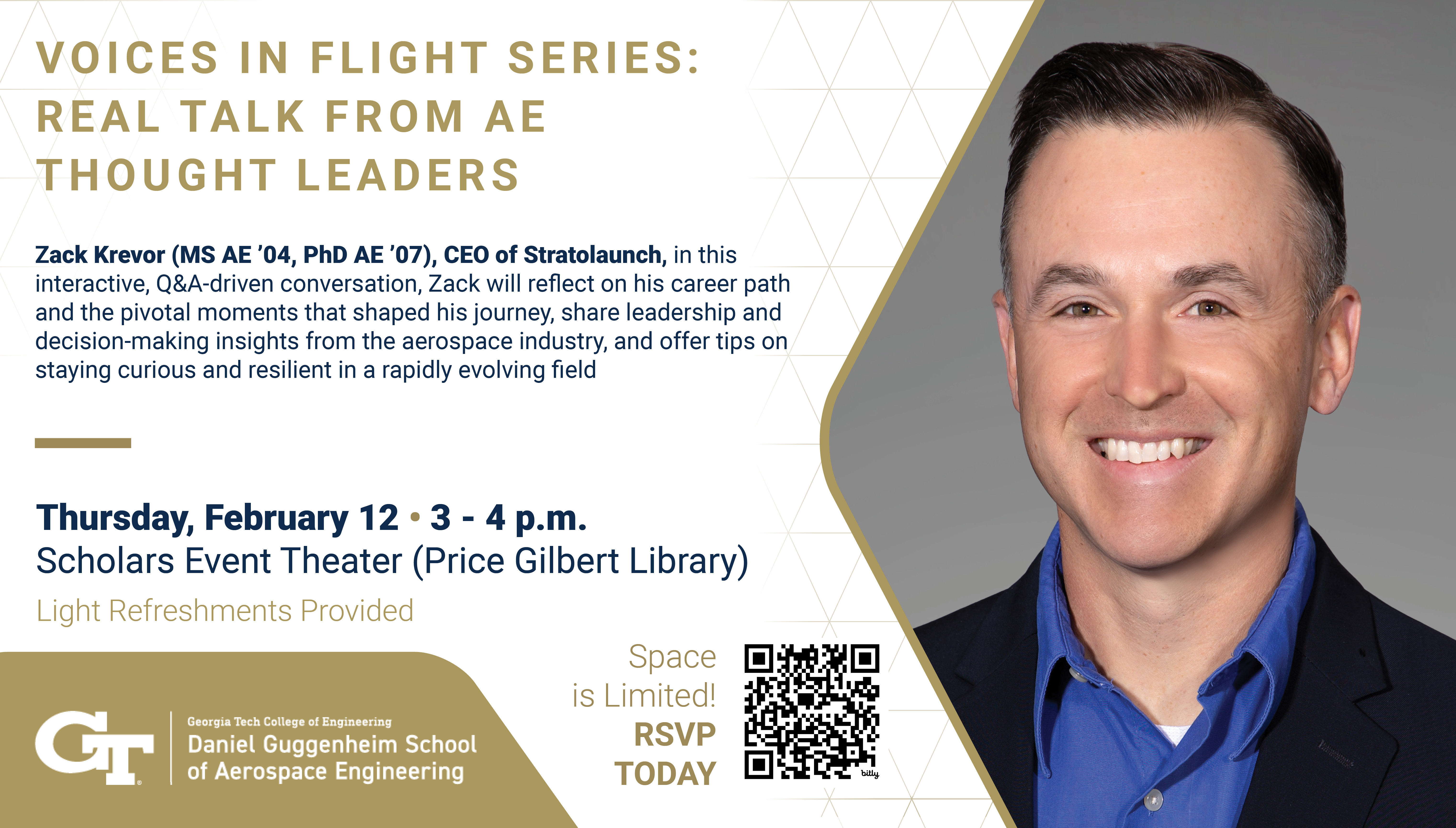 Zack Krevor (MS AE ’04, PhD AE ’07), CEO of Stratolaunch, in this interactive, Q&A-driven conversation, will reflect on his career path and the pivotal moments that shaped his journey, share leadership and decision-making insights from the aerospace industry, and offer tips on staying curious and resilient in a rapidly evolving field