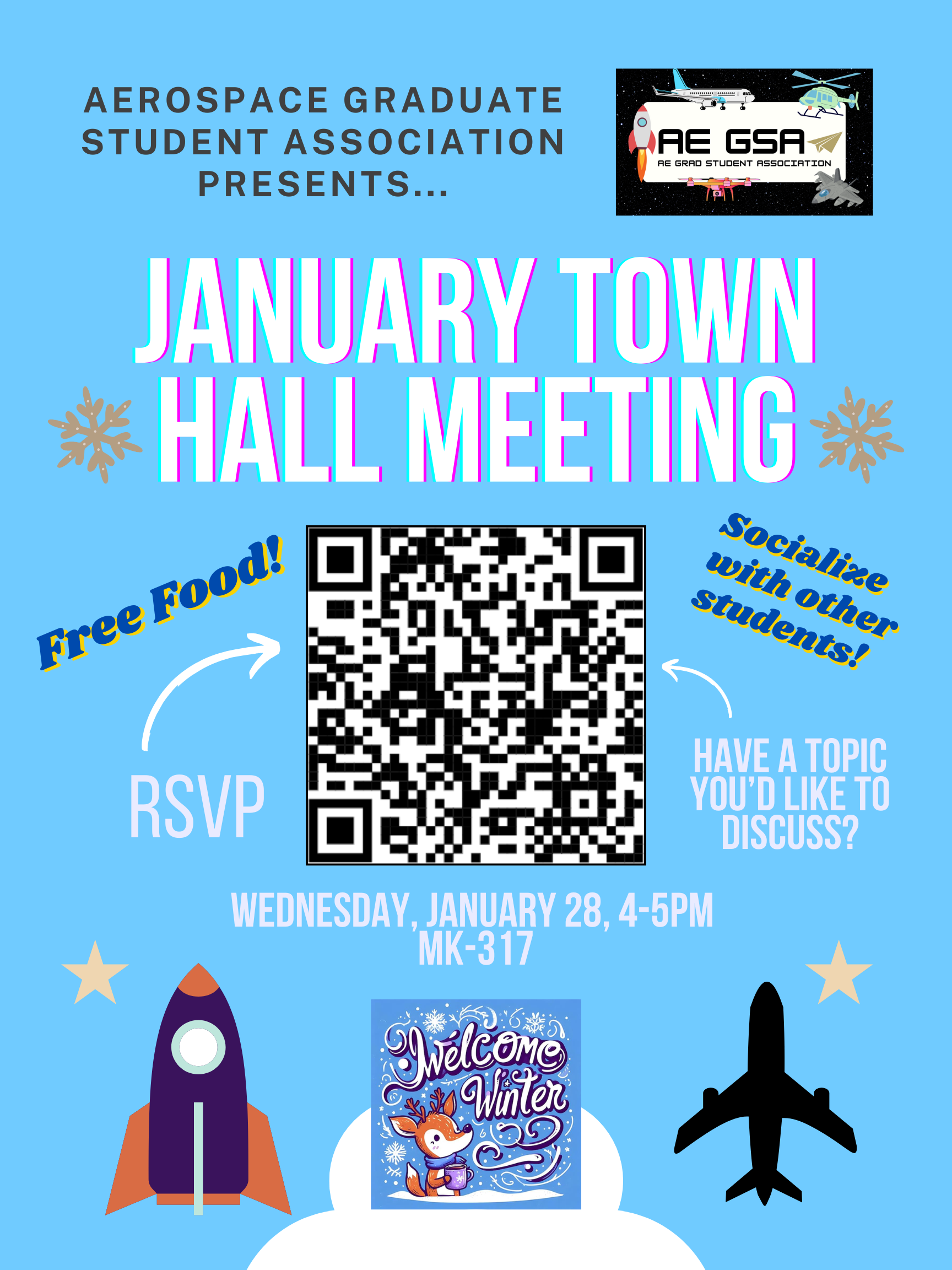 First town hall of the year! We'll be having our January Town Hall next Wednesday, January 28th, from 4-5pm in MK 317. Come out to socialize with other AE graduate students, have some yummy food, and discuss grad school topics! Our focus topic for this town hall will be research opportunities. As always, let us know if you have questions, and we hope to see you there! Please RSVP here: https://forms.gle/muG8CjUx21GRDTFZ6"