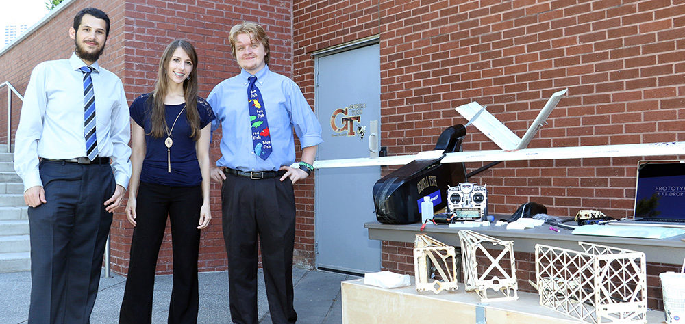 | Taking Home the Gold. From left, Saleh Tarazi, Kayleigh Lane, and Matt Gilmartin, "Team Pelican" stand before their entry in the 2017 Capstone Design Expo. The three seniors took home the top prize for aerospace engineering projects. The prize for best project overall went to "Pump-it-Up" a project of the School of Mechanical Engineering. See more photos of the event. |