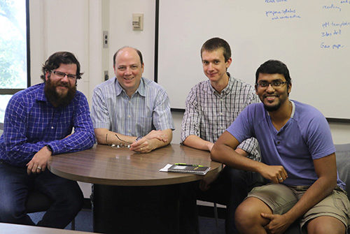 | Aiming Cupid's Arrow. Space System Design Lab (SSDL) director E. Glenn Lightsey (second from left) is seen here with members of his lab (from left) Sterling Peet, Terry Stevenson, and Roshan Selvaratnam. The four researchers are working together on the Cupid's Arrow study. |