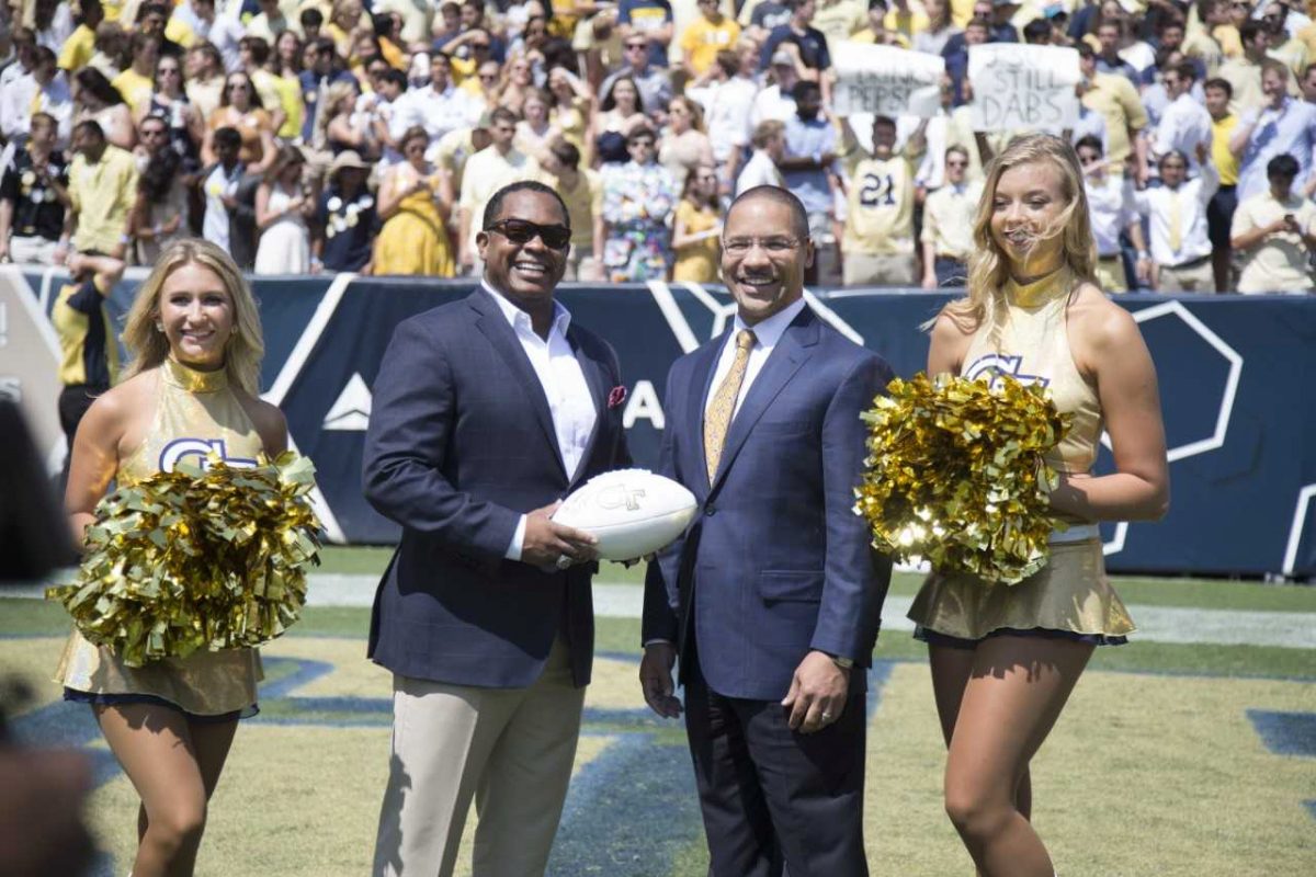 Above: Prof. Mitchell L.R. Walker II (right) receiving the Georgia Power Professor of Excellence Award from Jason Reynolds, director of Environmental Affairs - Southern Company, during the Yellow Jackets' matchup against Jacksonville State on Sept. 9.