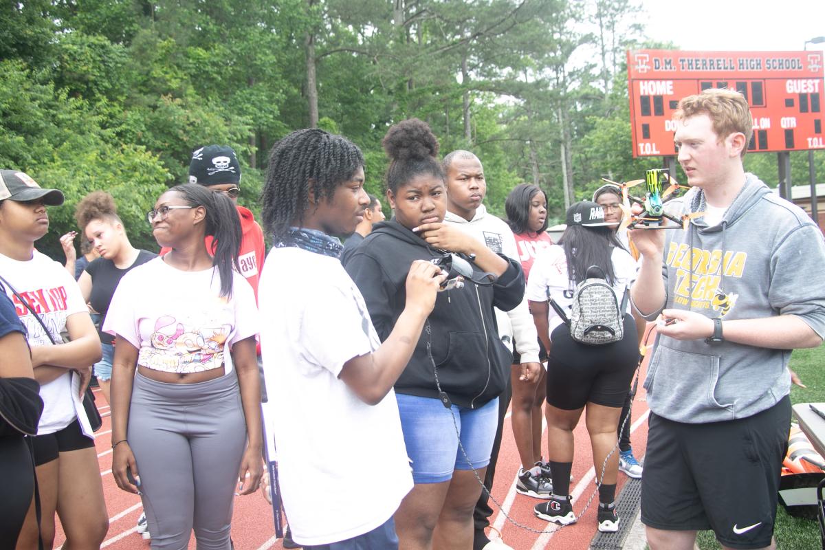During the demonstration, Wyckoff skillfully operated the drones sending them above the tree line and across the football field. The onlookers couldn’t contain their enthusiasm as the blue, light-framed drone zipped through the air, eliciting cheers and screams of joy from students at other stations. To further enhance the experience, students had the opportunity to don goggles, providing a bird’s eye view as the drone soared overhead. They also had access to a monitor displaying the drone’s flight, further immersing them in the experience.